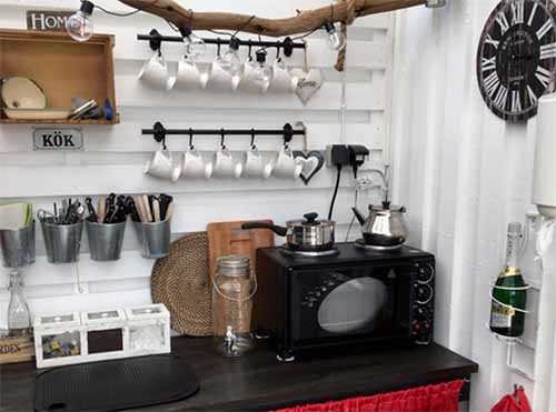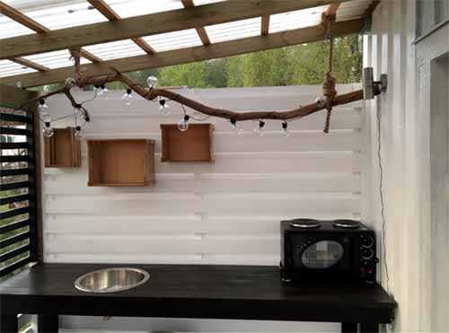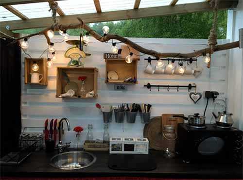 Все делалось с минимальными затратами: в качестве кухонных полок используются деревянные фруктовые ящики, для освещения кухни приспособили ветку от яблони.