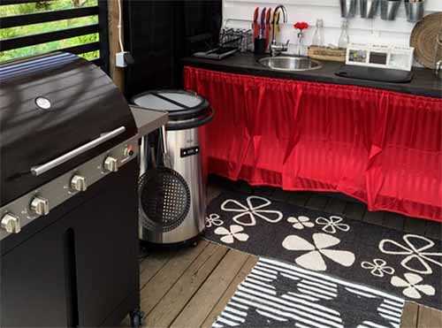 Эта летняя кухня включает в себя: рабочий стол с подводом воды, электричество, электропечь, барбекю и передвижной обеденный стол.