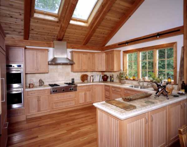 дачный колорит этой кухне придают полы и массивный потолок из натуральных пород дерева