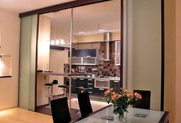 Стеклянная раздвижная перегородка между кухней и гостиной