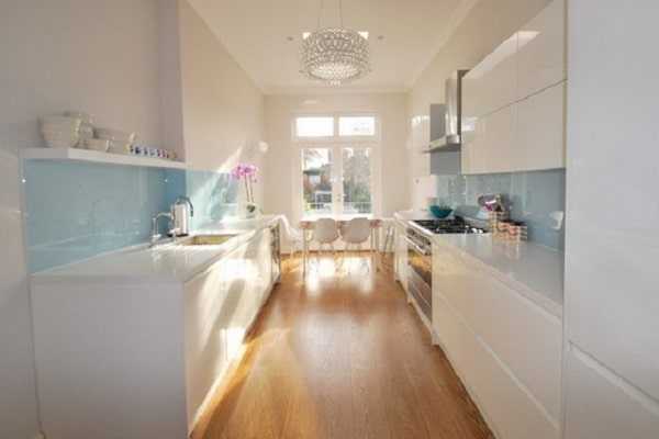 - Прямолинейная планировка подразумевает размещение бытовой техники в один ряд. В таком случае остается много квадратов для обустройства гостиной. В интерьере с таким расположением гарнитура будут хорошо смотреться диван-трансформер, большой стол, стенка.