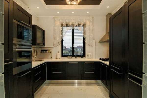- П-образная планировка акцентирует основное внимание на рабочей зоне, поэтому кухонный гарнитур занимает много места. Мебель располагается вдоль трех стен с захватом двух углов. Для обеденной части подобного интерьера подойдут большой обеденный стол, мягкий уголок и диваны.