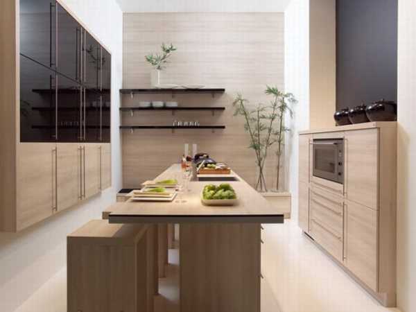 Для увеличения полезного пространства рекомендовано использовать угловой кухонный гарнитур или планировку мебели в виде символа П. В этом случае на границе функциональных зон устанавливают столешницу и барную стойку. При оформлении дизайна рекомендовано выбирать закрытые шкафы с выдвижными ящиками и полками, что поможет спрятать от посторонних глаз продукты питания и столовые приборы. В просторной функциональной мебели можно расположить микроволновую печь или духовку, а также другие бытовые приборы.