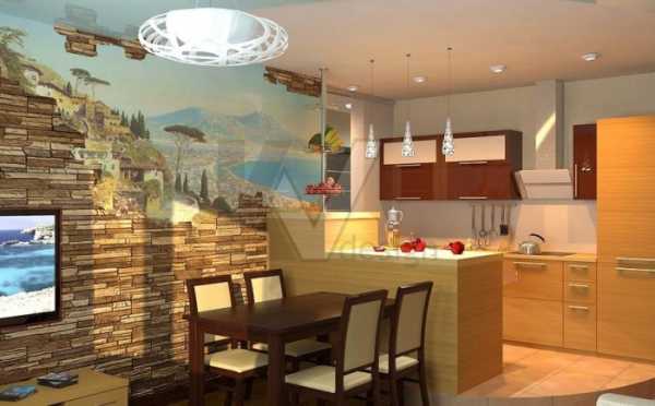 Необычный яркий декор на стенах для небольшой кухни-гостиной