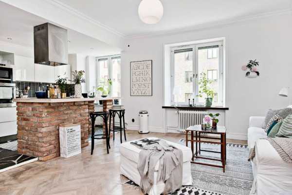 Оптимальное решение для интерьера квартиры 38 кв. метров – скандинавский стиль: нейтральные по цвету стены и потолок, деревянный декор и минимум мебели.