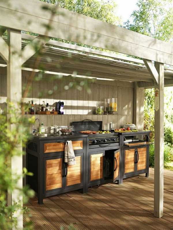 Если хозяева наведываются только летом, кухня может быть открытой, фактически представляющей собой площадку для готовки и принятия пищи с навесом и несколькими стенками. Самый простой набор – мангал и комплект садовой мебели. Такая летняя кухня годится только для вечерних посиделок с гостями, приготовления шашлыка, да и то, только в хорошую погоду. Необходимую утварь придется каждый раз приносить из дома. Можно использовать технику, но тогда над жарочными панелями обязательно должны быть герметичные крышки. Также можно установить зонтик над раковиной и рабочей поверхностью. Для мебели следует использовать материалы, которые не страдают от влажности и дождей, ведь она постоянно будет подвергаться этим воздействиям. Более многофункциональна открытая кухня с навесом, который может быть оформлен разным образом.