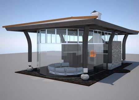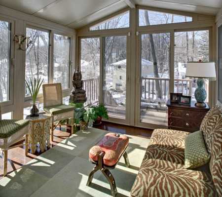 Неплохим вариантом для отдыха станут закрытые веранды с двумя смежными стенами, оставляющими вид на природу. Допускается использовать для разделения зон и раздвижные перегородки. Они дают возможность превратить закрытые веранды к дому или к кухне в объединённые беседки типа, подходящие для разных погодных условий. Во время холодов люди перемещаются внутрь, при потеплении – возвращаются на улицу.