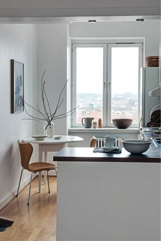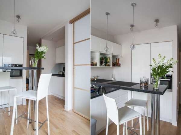 В объединенном пространстве кухни-прихожей редко остается место для обеденной зоны. В таком случае ее функции выполняет барная стойка. Однако если осталось 1-2 кв. м свободного пространства, организовать обеденную зону не составит труда.