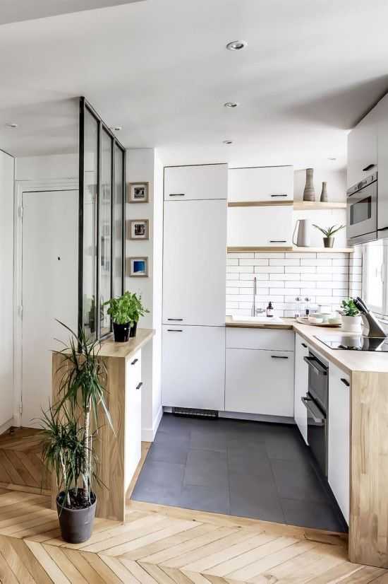 Любое совмещенное пространство требует грамотного зонирования. Для выделения кухни в прихожей применяют различную отделку пола, стен, потолка, а также всевозможные перегородки и мебель.
