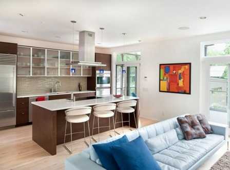 Жизнь в современном мегаполисе диктует новые стандарты комфорта. Если раньше большая квартира должна была иметь как минимум кухню, гостиную и спальню, то теперь для многих это отнюдь не аксиома. Тесной кухонке и просторному «залу» (с традиционным мягким уголком, большим обеденным столом, сервантом и телевизором) многие предпочитают кухню, совмещенную с гостиной.