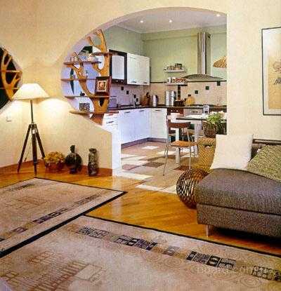При сносе перегородки можно оставить часть стены – в виде небольшого простенка, который прикроет готовочную зону, либо широкой арки, классической или фантазийной формы. При этом зона кухни четко отделяется от остального пространства.