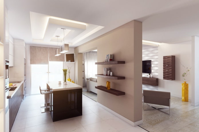 При условии большой площади совмещённого помещения с высокими потолками можно воспользоваться таким эффективным дизайнерским приёмом зонирования, как распределение уровней потолка и пола. Многоуровневый потолок со встроенной подсветкой поможет создать визуальную границу кухонного сегмента с зоной отдыха.