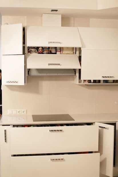 Установили доводчики и подъемные механизмы, что здорово упрощает пользование кухней. Стоит частично — фурнитура BLUM, частично — GTV (к сожалению, мастер оказался непорядочным).