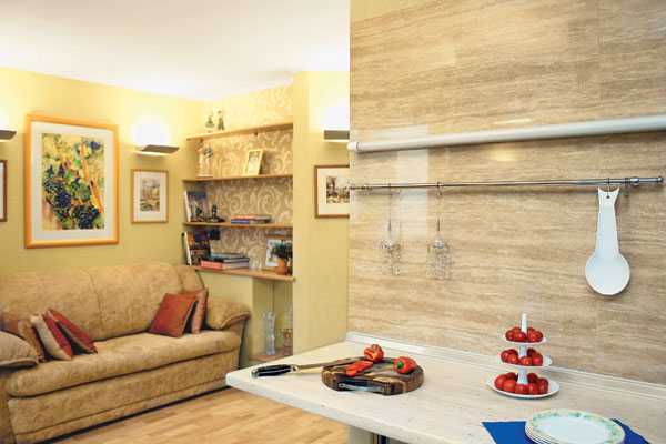 - Вместо традиционных распашных дверей используйте раздвижные модели или в форме гармошки. Радикальный вариант действий – убрать двери. Но в таком случае позаботьтесь, чтобы кухня была оборудована мощной вытяжкой.