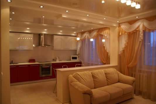 Современный дизайн гостиной совмещенной с кухнейГде уместно совмещение