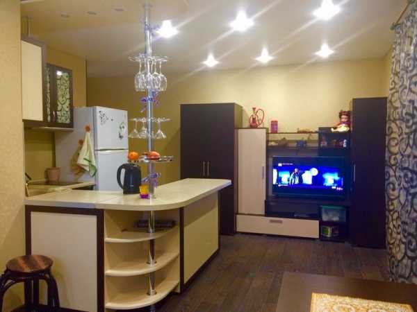 В такой квартире совмещенная кухня – не просто один из вариантов дизайна, а абсолютная необходимость. Кроме того, здесь же обычно размещают и спальню, используя как спальное место диван, или встроенные откидные кровати.