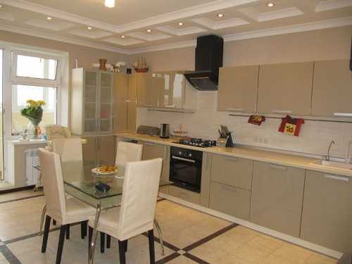 Этот прием уместен только в квартирах, где потолок достаточно высокий. Создание разноуровневого пола в кухне-гостиной – эстетичное и прагматичное решение. Под приподнятым кухонным полом можно спрятать многочисленные коммуникации. С помощью незначительного возвышения можно отделить и зону столовой. - С помощью потолка.