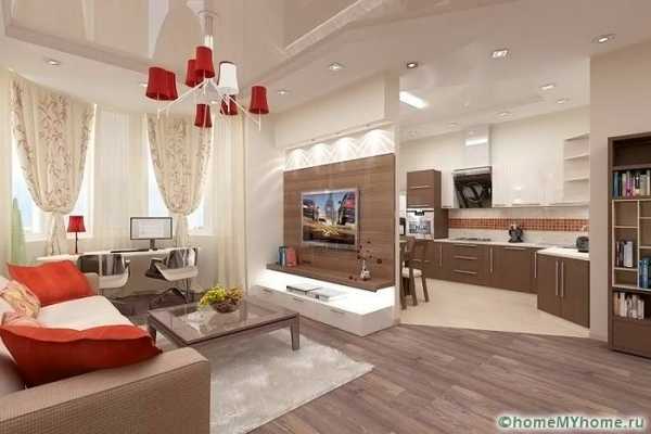 Вариант совмещения гостиной с кухнейДостоинства и недостатки совмещения