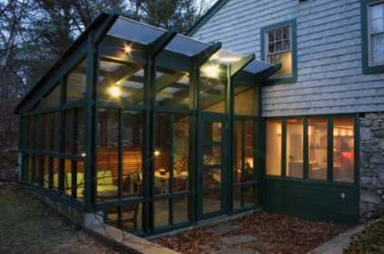 Для зимней кухни отличным решением станет обустройство камина. Для этого нужно поставить стеклопакеты тёмного оттенка, выполненные под дерево, и способные хорошо держать тепло. Желательно отдавать предпочтение таким стеклопакетам, которые можно снять без особых усилий, как только наступит летняя погода.
