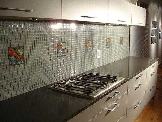 Наиболее оригинально выглядит кухонный фартук, выложенный мелкой мозаикой, хотя с практической стороны в смысле ухода это самый трудозатратный вариант.