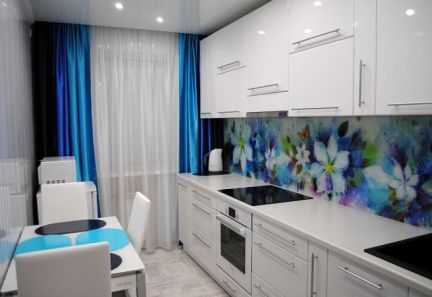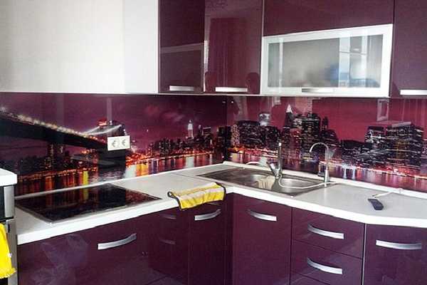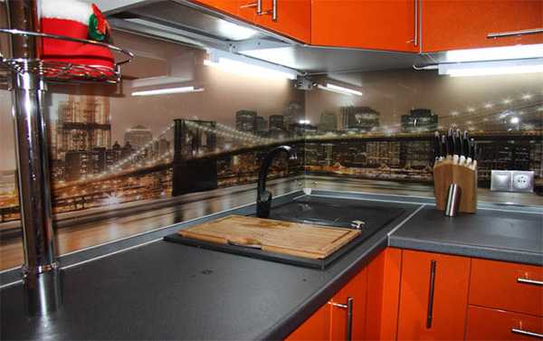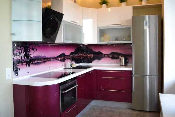 Оформление рабочей стены таким материалом поможет визуально расширить пространство в небольшом помещении. Идеальным вариантом будет панель из прозрачного стекла, а за ним поместить какое-либо изображение или просто цветной материал, то с помощью подсветки можно создать эффект зеркала, что зрительно расширит помещение.