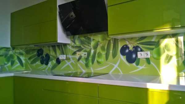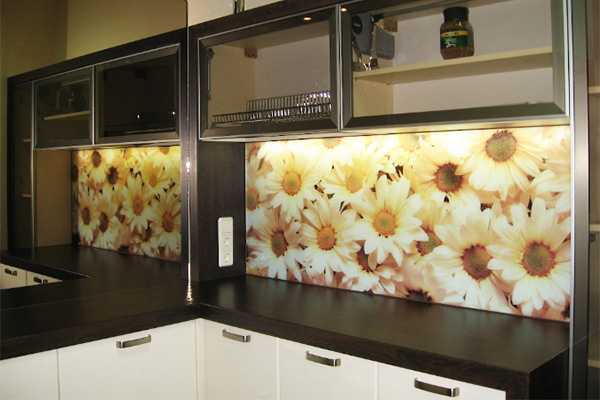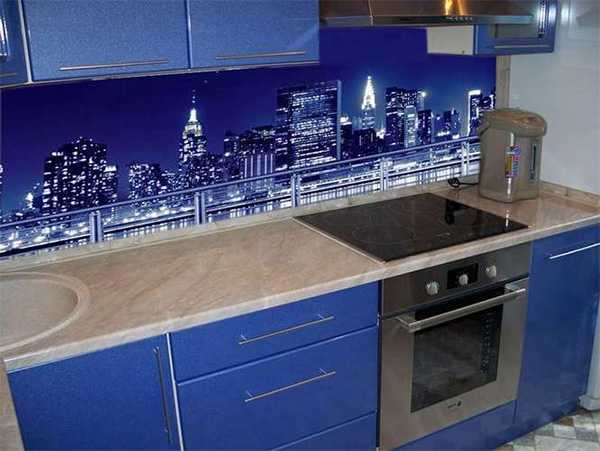 На фото — ПВХ-пленка за акриловым экраном.- Еще один вариант с фотопечатью предполагает нанесение изображения на ПВХ-пленку и закрепление последней на поверхность изделия. Однако для кухонного фартука такой способ не слишком удачен. ПВХ-покрытие отслаивается при постоянном нагреве или высокой влажности. С другой стороны, это позволяет с легкостью удалить ПВХ-пленку и обновить дизайн кухни буквально за час.