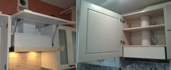 - Подъемные – удобные модели, отлично зарекомендовавшие себя на кухнях небольшой площади, где пространство нужно экономить. Дверцы таких шкафов могут подниматься и фиксироваться на диагональных упорах, скользить вертикально в пазах или вовсе складываться, как роллеты.