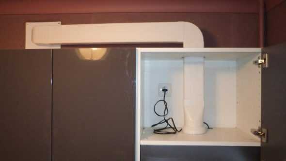 В полках шкафчика придётся выпилить отверстия для пропуска воздуховода