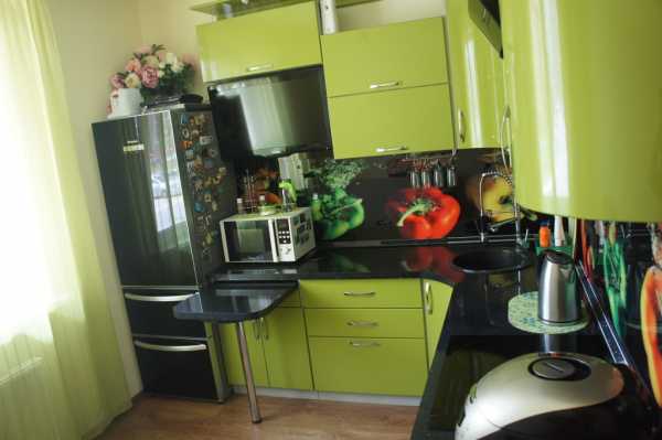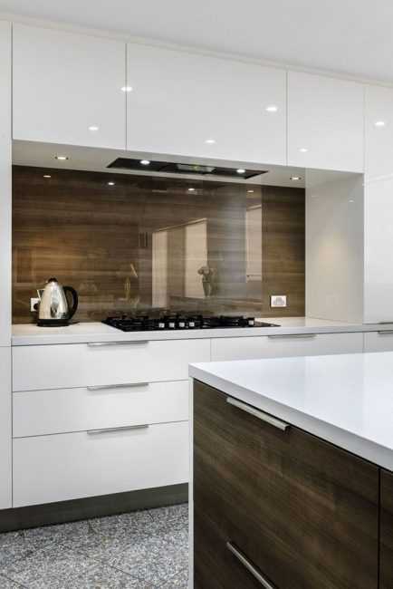 Стеклянное полотно отражает пространство кухни, используется для зрительного увеличения пространства.