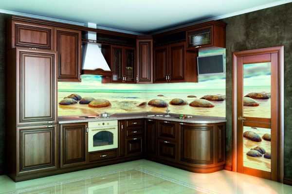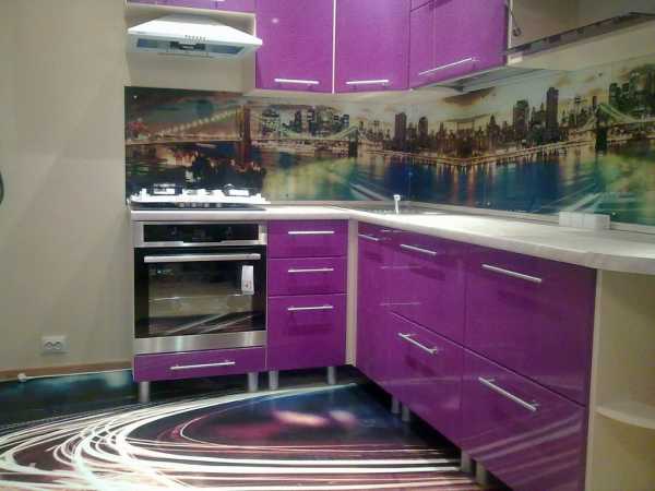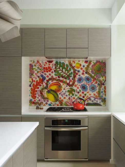 Такие панели называются «скинали». На изнаночную поверхность стекла наносится любое изображение, которое нравится владельцу кухни, делается это с помощью особой технологии. Специальные чернила, используемые в данном процессе, не выгорают на солнце, не боятся повышенной влажности и спокойно выдерживают температуру до 120 градусов. Недостаток такой панели всего один — рисунок может быстро надоесть, и тогда придется полностью переустанавливать кухонный фартук.