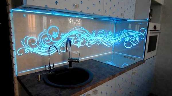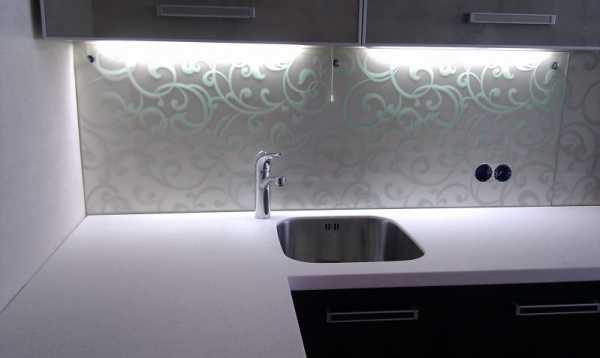 Кроме выбора рисунка и цветовой гаммы важно продумать освещение фартука. Правильно подобранная подсветка может украсить даже самую простую панель из стекла на фартуке кухни. Точечные светильники или диодная лента выгодно подчеркнут любой рисунок скинали.