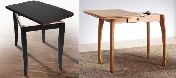 Аналогичный пример трансформации возможен для квадратных или прямоугольных столов, по-другому эти модели называют книжки. В собранном виде такие модификации не производят впечатления столов – упущенные половинки не скруглены, и плотно прижаты в виде обычных боковин тумбы, ширина которой при необходимости не превышает 20 см. Сверху такой узкой полки можно поставить вазу или книги.