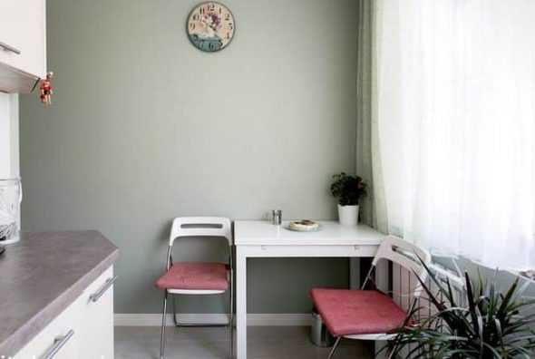 Еще одним вариантом оборудования небольшой кухни являются откидные модели. Столешница в сложенном виде прижата к стене и выступает не более чем на 10-15 см. При необходимости приема пищи столешницу раскрывают, и образуется небольшое посадочное место для двоих человек. Такой вариант мебели удобен для самых малогабаритных квартир, где в кухне не хватает места даже для небольших столиков. Стулья в этом случае также лучше выбирать складные, для экономии пространства. Кстати, диетологи зачастую рекомендуют такие модели, так как человек ленится раскладывать изделие и поэтому может пропустить большой прием пищи и обойтись небольшим полезным перекусом в виде яблока или питьевого йогурта.