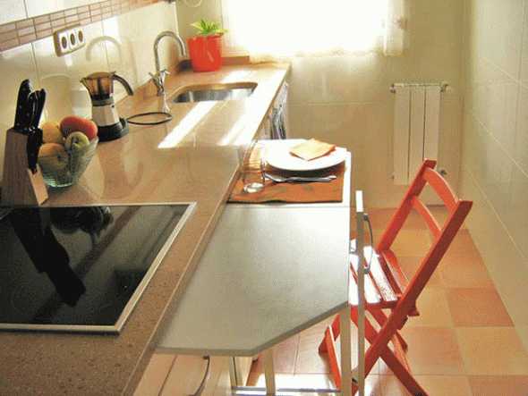 Эта конструкция проста и в то же время очень удобна и функциональна. Когда стол сложен, он не будет мешать вам передвигаться по кухне, при этом за ним могут разместиться два-три человека.