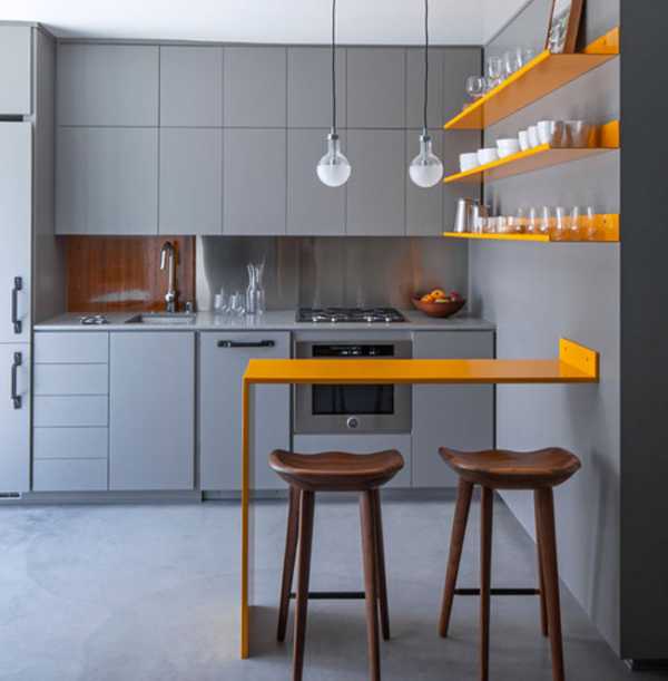 Еще одним вариантом экономии пространства выступает барная стойка. Ее можно крепить в прямоугольных узких и длинных кухнях к стене, противоположной основной кухонной мебели. Ширина столешницы может не превышать 50 см. Для барной стойки приобретаются аналогичные стулья, которые можно прятать под высокой стойкой, тем самым обеспечивается свободный проход в кухне.