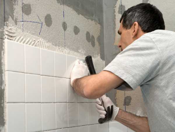 После вытяжки стен, стяжки пола и монтажа основной сантехники можно приступать к укладке плитки. Использование гипсокартона без свойств гидроустойчивости в ванной неразумно – поэтому потолок лучше оставить без дополнительной отделки или оклеить плиткой на влагоупорном клее.