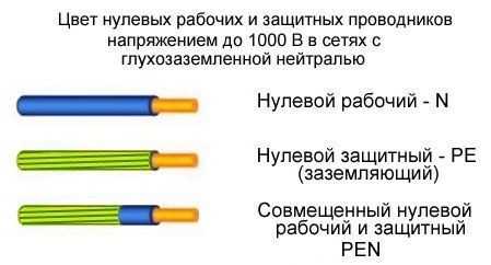 двухцветной комбинации зелено-желтого цвета по всей длине с голубыми метками на концах линии, которые наносятся при монтаже — для обозначения совмещенного нулевого рабочего и нулевого защитного проводника