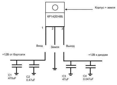 Существует множество готовых схем-стабилизаторов для 12-вольтовых приборов. Чаще всего на прилавках можно найти микросхему КР142ЕН8Б или подобные ей. Данная микросхема расчитана на ток до 1.5А, но для большего эффекта нужно включение с применением входных и выходных конденсаторов.