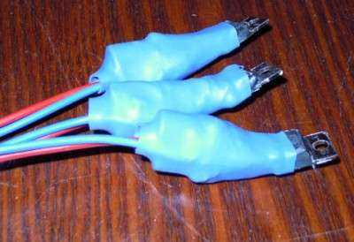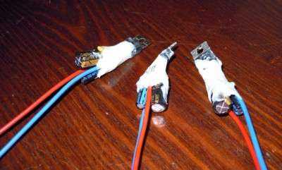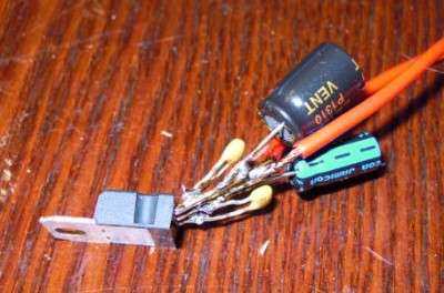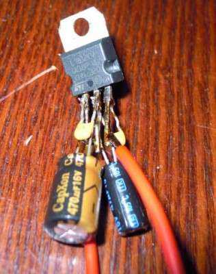 К микросхеме припаяны, помимо конденсаторов, два провода, соответственно вход и выход. Масса будет приходить через крепление микросхемы. Средняя нога микросхемы задействована только под ножки конденсаторов. Выводить провод от нее я не стал, так как она объединена с корпусом схемы.