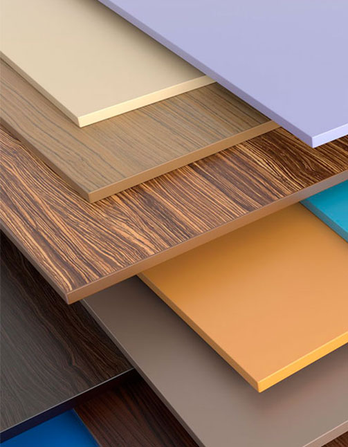 Меламиновый ламинат обычно устойчив к пятнам, теплу и огню. Он устойчив к влаге и царапинам и доступен во многих цветах, узорах, размерах и толщинах, что делает его идеальным для ДСП, фанеры или МДФ. Меламин больше похож на небольшие кусочки дерева (ДСП), склеенные и спрессованные между собой и покрытые пластифицированным покрытием .