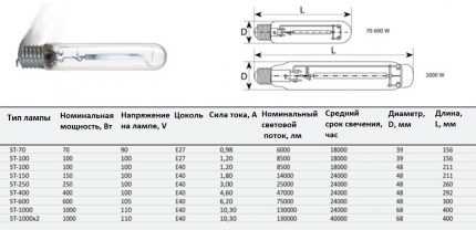 В таблице представлены основные сведения о самых популярных лампах ДРЛ (дуговых ртутных люминесцентных) и осветительном приборе натриевом. ДРЛ с четырьмя электродами имеет большую светоотдачу, чем с двумя