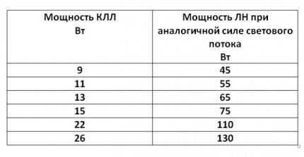 Данные о мощности КЛЛ заложены в маркировку светового прибора. Там же есть сведения о виде цоколя, цветовой температуре, виде ЭПРА (встроенный или внешний), индексе цветопередачи
