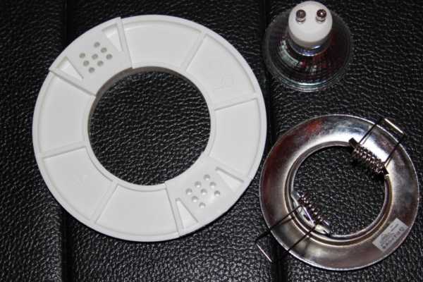 - Купить пластиковые кольца для монтажа светильников. Стоит учесть, что они бывают разного диаметра, под конкретные светильники, именно поэтому рекомендуется начинать с выбора и покупки светильников. Также существуют универсальные кольца, в таком случае необходимо срезать их до получения отверстия необходимого нам размера.