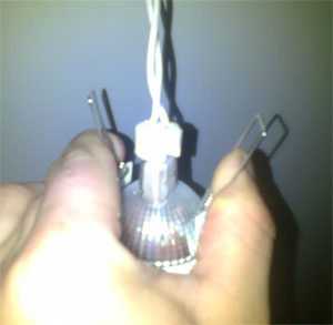 - Сам светильник необходимо подключить к колодке, вытащив ее из полученного отверстия. Затем поджать два пружинных фиксатора находящихся по бокам, и осторожно направить его в смонтированный держатель. При помощи пружин, светильник сам станет на место и притянется к потолку.