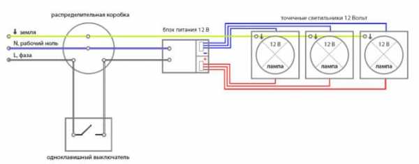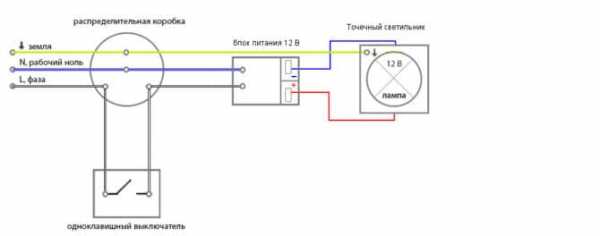 Схема включения светильника на 12 вольт в осветительную сеть (полярность включения роли не играет)При необходимости ты можешь использовать один блок для питания группы ламп. При этом лампы подключаются к источнику питания параллельно. Мощность блока питания, конечно, должна быть на 15-20% больше суммарной мощности, потребляемой всеми лампами.