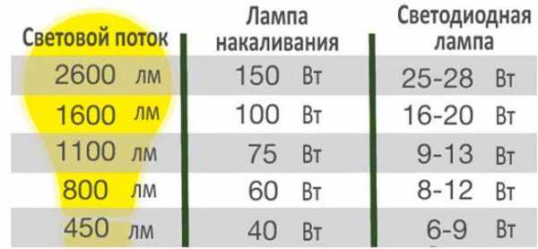 | Световой поток, лм | Лампа накаливания, Вт | Светодиодная лампа, Вт |