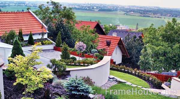 Рельеф участка может быть мощным инструментом формирования дизайна. Например, со склона могут открываться отличные виды, не закрываемые ближайшими постройками. В этом случае расположение дорожек и открытых пространств лучше ориентировать сверху вниз. Это поможет создать великолепный простор даже на небольшом участке. Густой зеленью можно замаскировать нижнюю границу участка, а высокими деревьями закрыть объекты, портящие вид.
