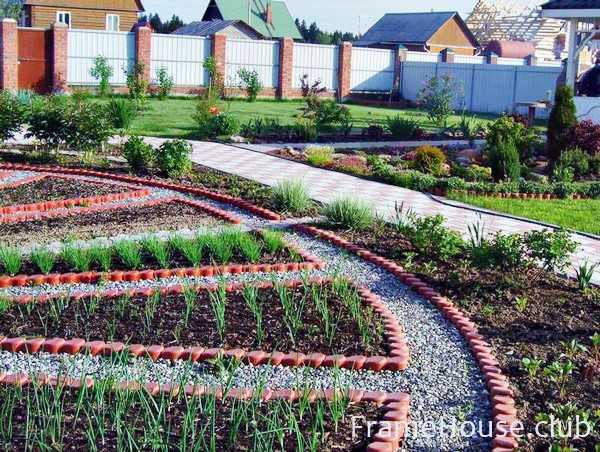 Здесь представлен вариант с большим количеством грядок. Для большего комфорта в перемещении на огороде ландшафтный дизайн участка загородного дома 10 соток представлен с удобными дорожками между грядками. Их количество, размер и направление может быть произвольным. В такой ситуации хозяйственную зону стоит отделить от остальной низким деревянным забором. Вход на эту территорию можно оформить калиткой с прямоугольными воротами или ажурной аркой.