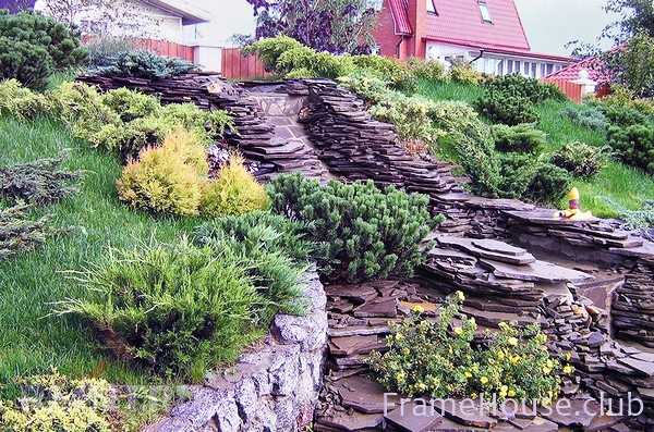 Слишком крутой рельеф можно сделать более удобным при помощи террасирования. Оформлять террасы можно аккуратными стеночками