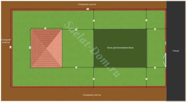 Сделать стандартную баню реально даже на небольшом участке. Планировка бани начинается после утверждения размера и положения жилой зоны. Её нужно располагать недалеко от дома, но не ближе, чем в 8 м. Пять метров отступают от забора и соседской границы. Это правило пожарной безопасности, учитывайте при планировке. Вблизи не сажают деревья, поскольку баня является отапливаемым объектом. Независимо от того, топится она дровами, или газом, возможна пожароопасная ситуация. Чтобы огонь не распространился на соседние постройки, делают отступы.